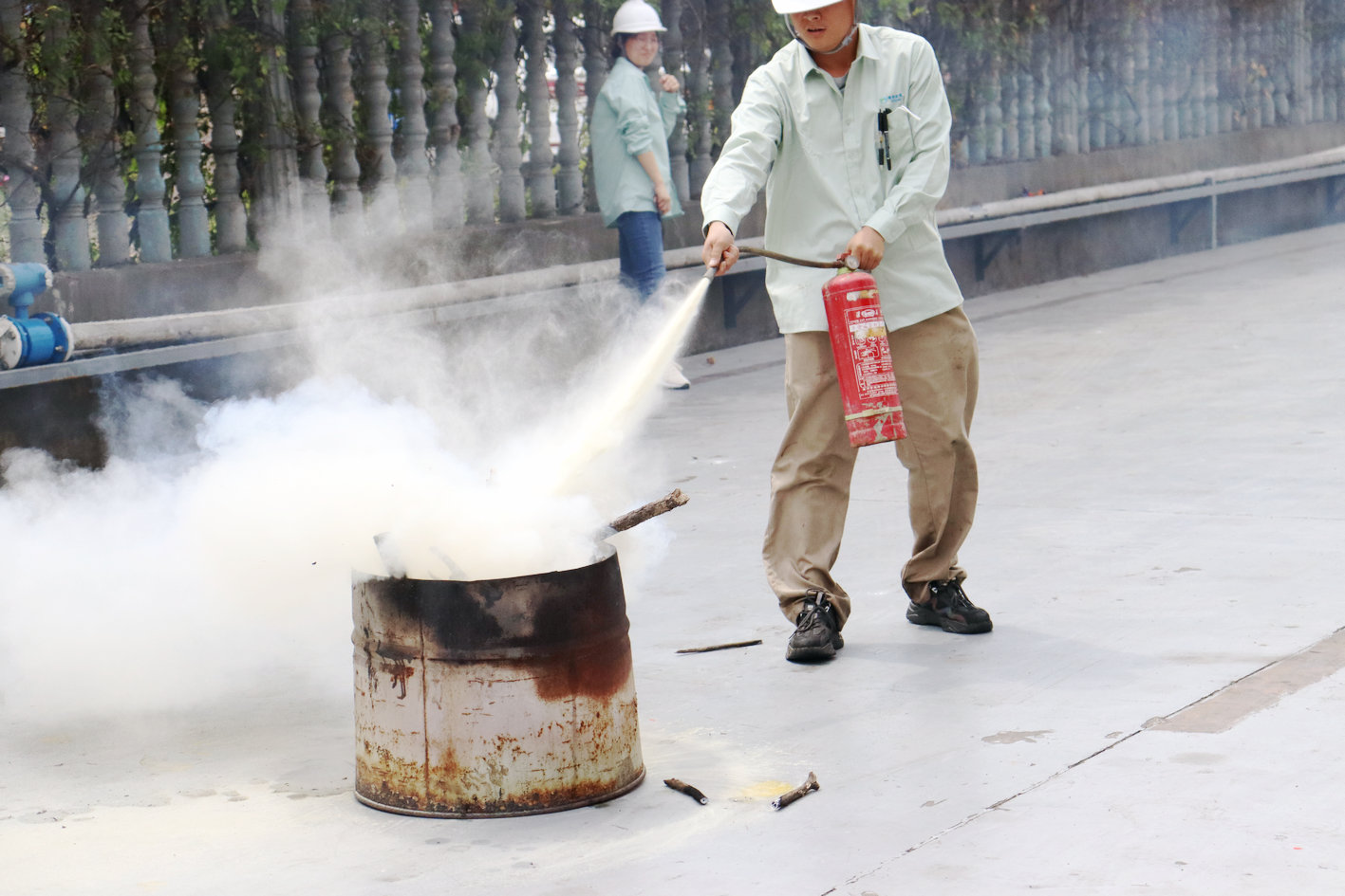 第二個項目是單人滅火比賽“烈火英雄”。50米的比賽場地分兩條賽道,設(shè)置起火點兩處,在最短的時間內(nèi)使用4公斤干粉滅火器將各自賽道內(nèi)的火焰撲滅者為優(yōu)勝。南北廠區(qū)分為兩大組,捉對競技。一時間,火焰翻騰,濃煙滾滾,我們的參賽隊員似利箭離弦,眨眼之間將火焰撲滅。現(xiàn)場不時爆發(fā)出陣陣加油聲和歡呼聲,不斷為參賽的同事加油打氣。
