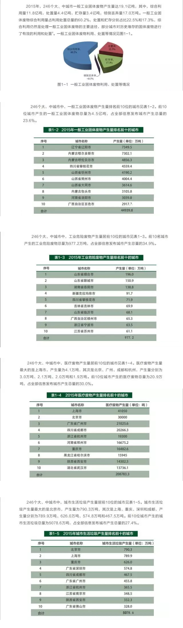 環(huán)保部今日發(fā)布《2016年全國(guó)大、中城市固體廢物污染環(huán)境防治年報(bào)》(以下簡(jiǎn)稱《年報(bào)》),從全國(guó)大中城市固體廢物信息發(fā)布情況、全國(guó)固體廢物污染防治工作進(jìn)展情況、全國(guó)固體廢物污染防治能力建設(shè)情況以及地方固體廢物污染防治工作實(shí)踐4個(gè)方面,系統(tǒng)介紹了2015年我國(guó)固體廢物污染防治工作的相關(guān)情況。